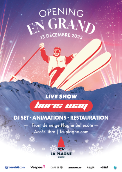 -puis le coup d'envoi officiel de la saison les 13 et 14 décembre 2025 avec un week-end "Opening" festif à Plagne Bellecôte, où est installé un village événement en après-ski avec des DJ Sets. Le DJ Boris Way en est la tête d’affiche.